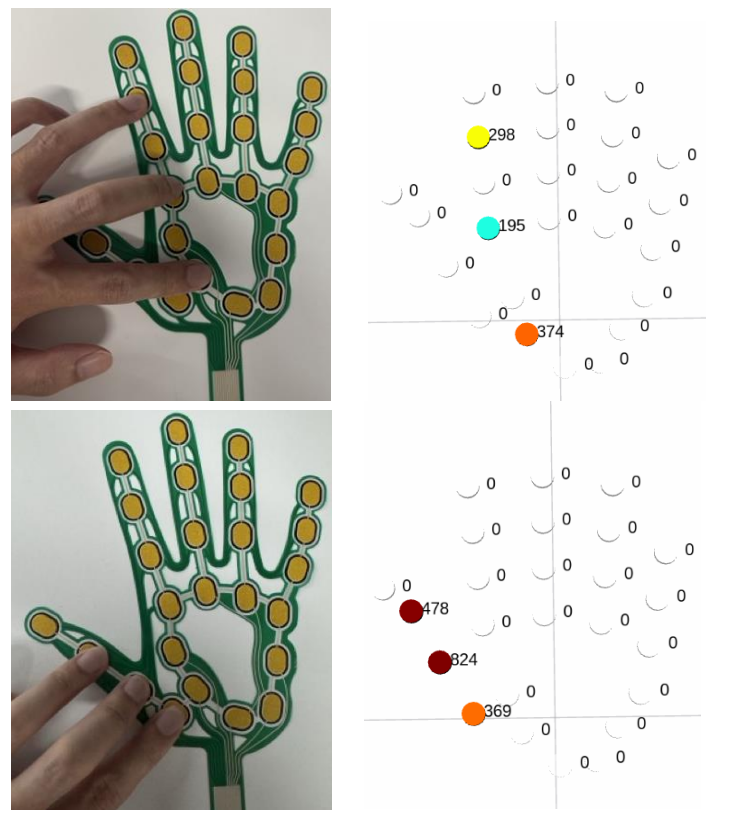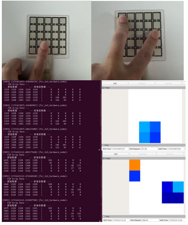 可视化展示 下图是我们近期的传感器实验效果,我们成功获取到两种压力传感器信息并且通过 Robot Operating System(ROS)发送给机器人。如图所示,压力传感器成功识别各类手势的力度。